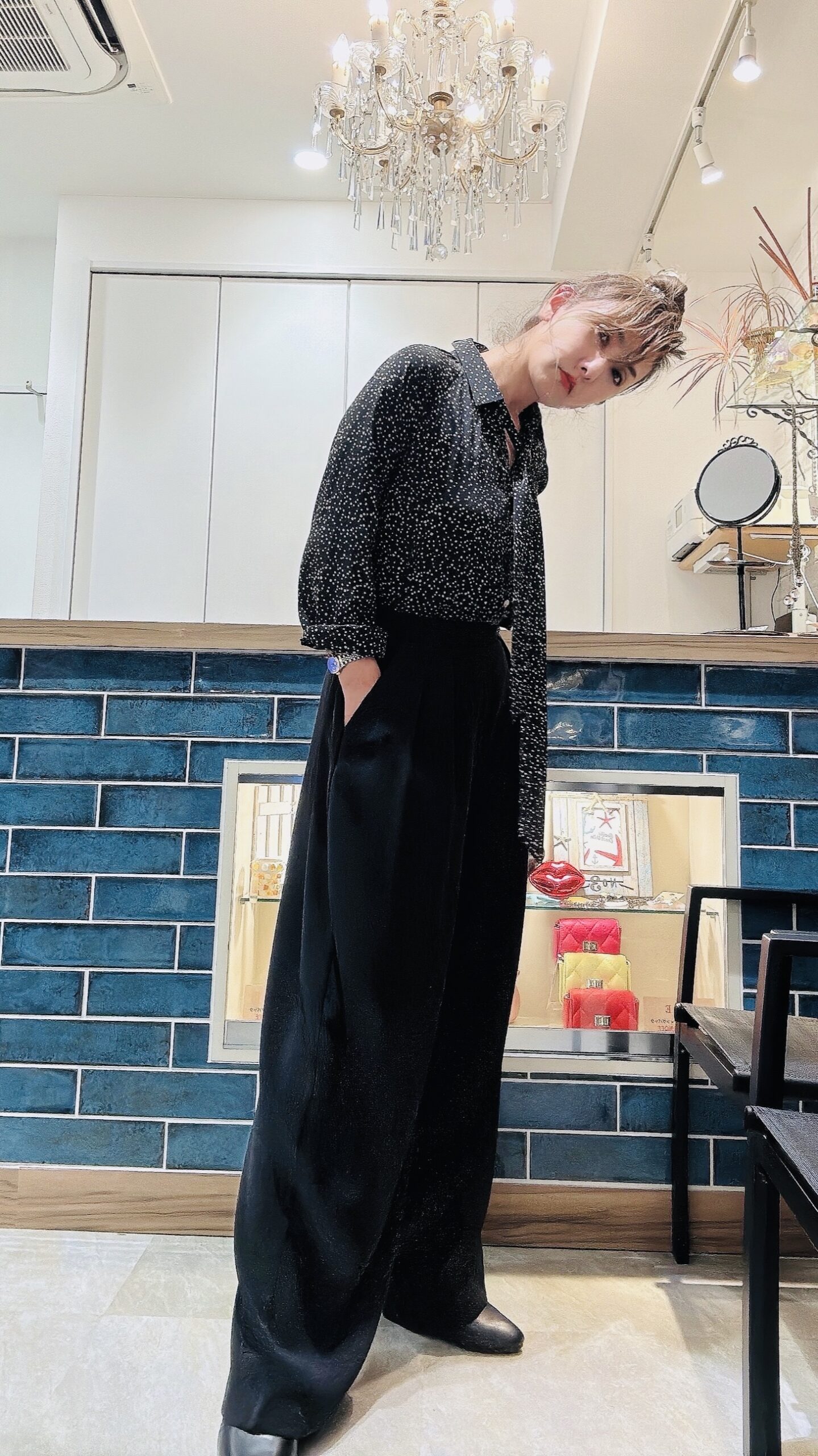 シルクのような光沢感のあるつるんとした素材のタイ付きドット柄ブラウス。