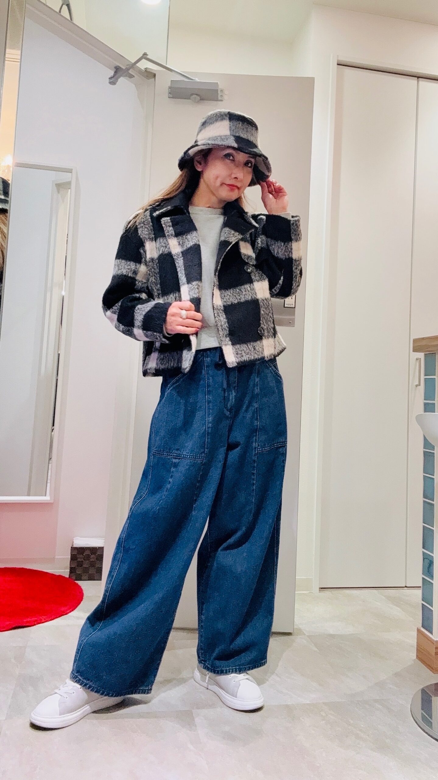 今年人気のクロップド丈のジャケットコートはゆったりとしたワイドシルエットのボトムと相性抜群です。