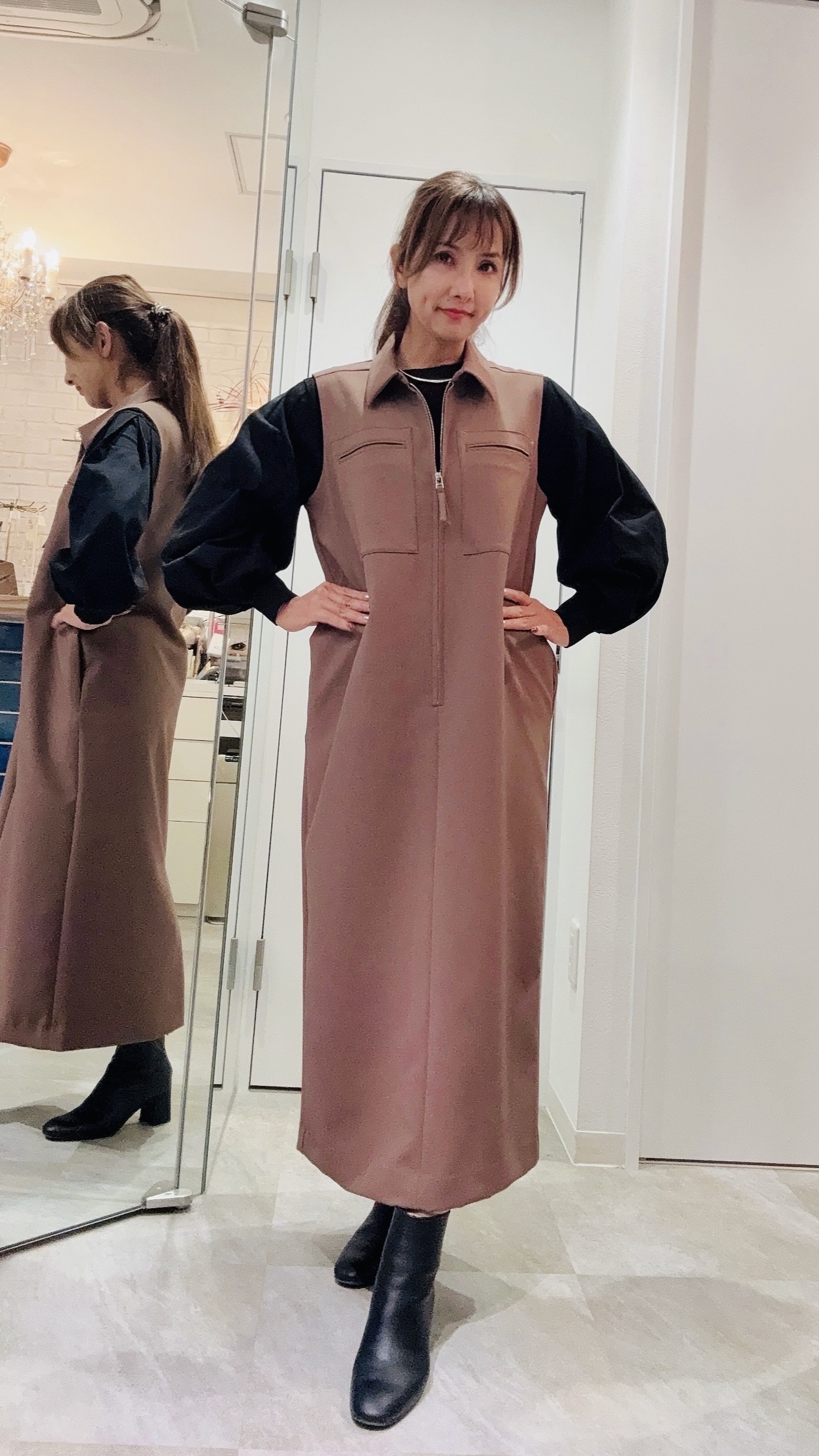 スッキリとしたIラインシルエットのベストワンピースは、シンプルなデザインなので様々なインナーと組み合わせることができます。