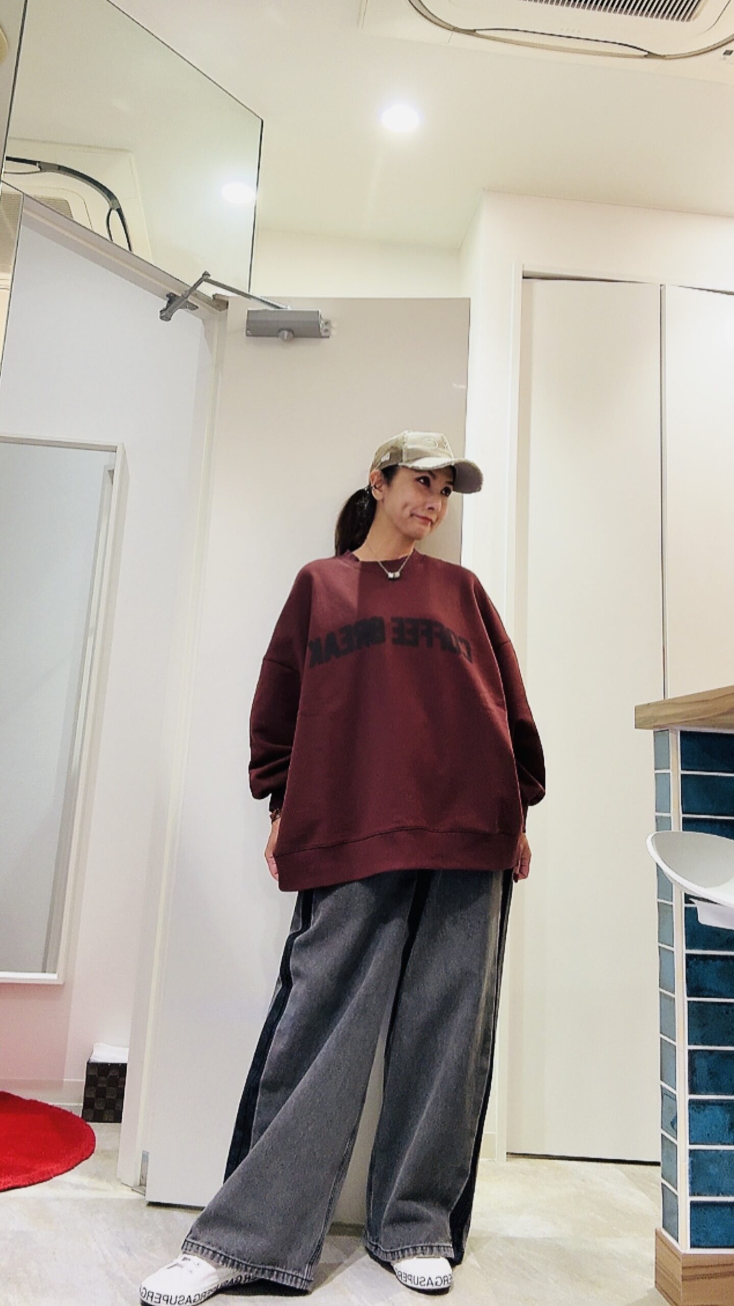 バーガンディカラーもコックリと大人っぽい印象で配色サイドラインのダークグレイのワイドパンツと合わせるとクールな大人カジュアルに仕上げてくれます。