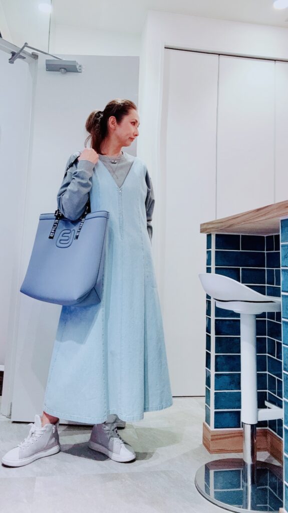 ブリーチ加工で明るいサックスブルーのジャンパースカート☆ 体型カバーしつつ、すっきり見えるフロントジップのV開き、ロング丈のAラインがおしゃれな演出をしてくれま…